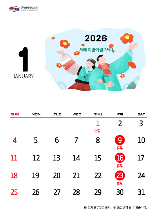 2026년 1월 코리아텅스텐 휴무일 안내 드립니다.