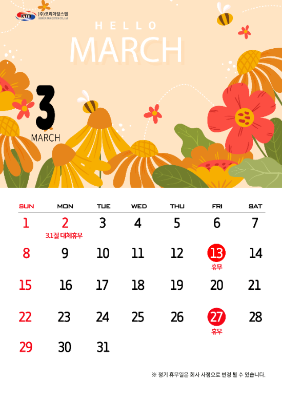 2026년 3월 코리아텅스텐 휴무일 안내 드립니다.