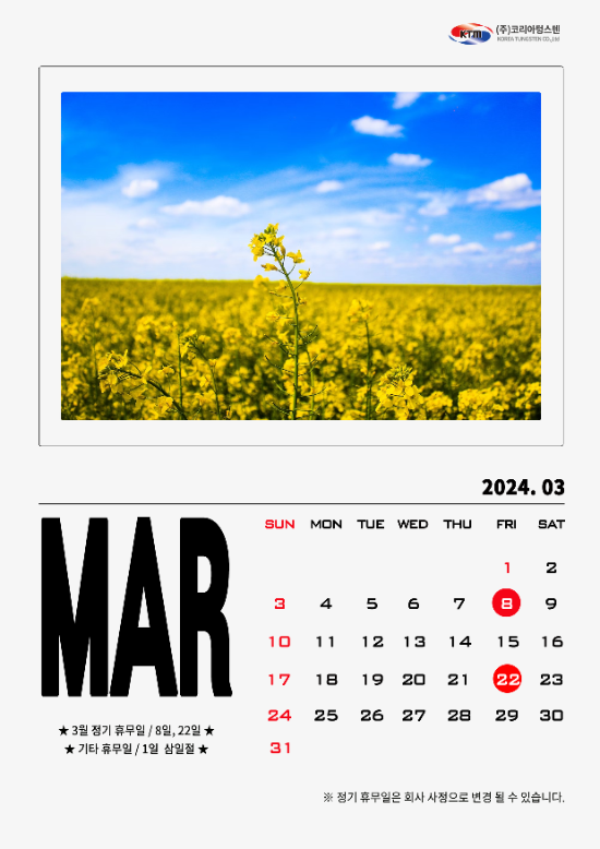 코리아텅스텐 2024년 3월 정기휴무 안내