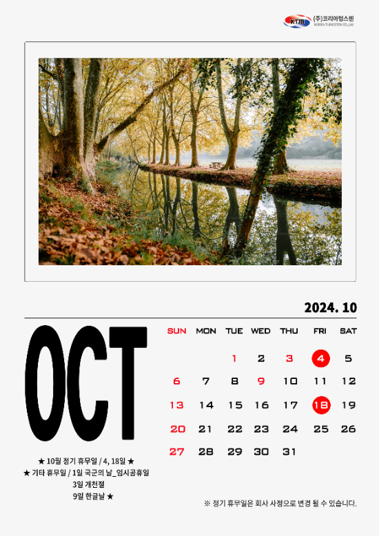 10월 코리아텅스텐 정기 휴무일 안내드립니다.